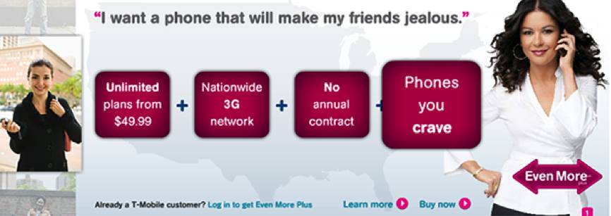 请确保您的着陆页上的每一个图片都传达了未在您的文案中未表现出来的商品或服务的某个优势,而不是为了添加图片而添加图片。让我们看一看下面的T-Mobile的着陆页面。