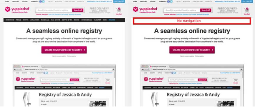 上述两个变量的唯一区别是左边的有导航栏而右边的没有。关于哪一个更好,在这方面没有什么意外。取消导航栏意味着减少对访客的干扰,并且能够让他们把关注点放在来此着陆页的首要原因。然而,真正令人意外的是,消除导航栏仅将转化率从3%增加到6%。这似乎是一个小数目,但是回顾之前可以发现,一个很小的变化可以导致转化率的100%增长。